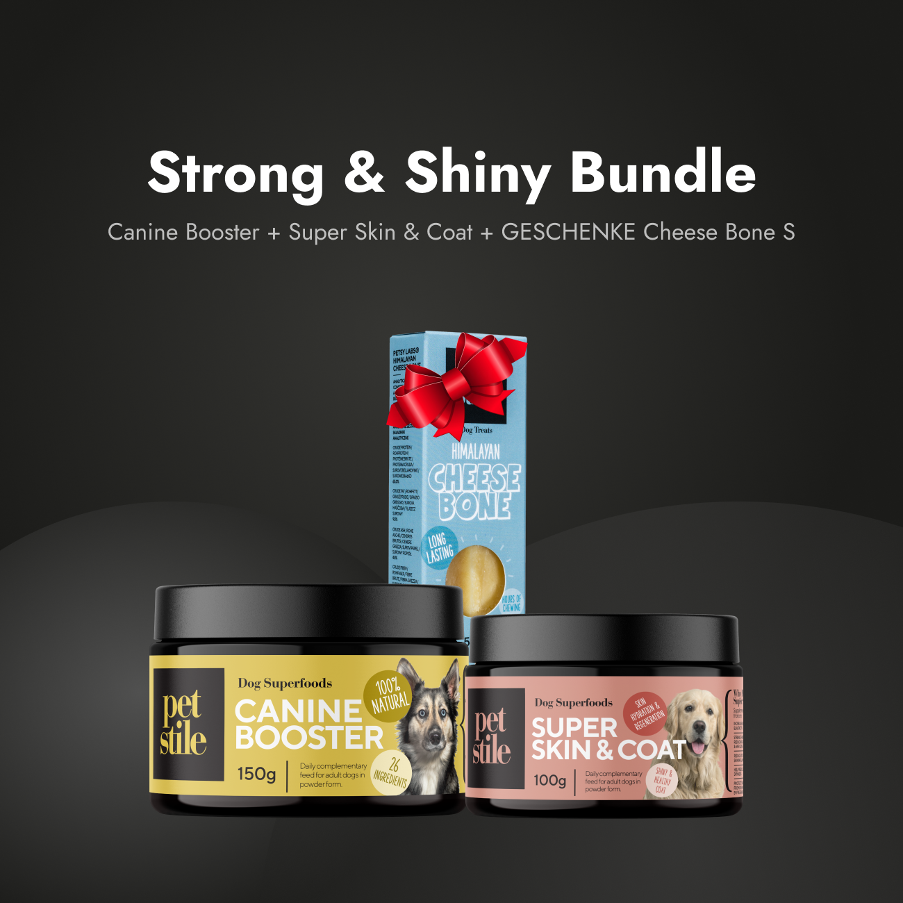 Gönnen Sie Ihrem Hund die ultimative Pflege mit dem Strong & Shiny Paket, das Canine Booster, Super Skin & Coat und einen GRATIS Himalaya Cheese Bone enthält. Dieses Paket unterstützt die Gesundheit der Gelenke, die Verdauung, die Haut, das Fell und die Zahnhygiene Ihres Hundes für ein umfassendes Wohlbefinden.