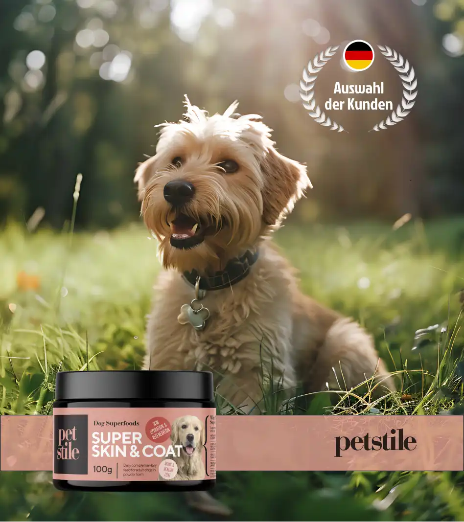 skin and coat ist super für glänzendes Fell. Mein Hund hat noch Welpenfell zum Teil. Das nachwachsene Fell glänzt ganz toll.